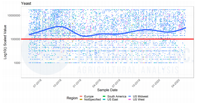 Across the U.S. (see Figure 1), the red dots correspond to samples with more than 1 million colony-forming units (cfu) per gram of feed or TMR. For reference, grab the top knuckle on your pinky finger. This represents about one (1) gram of feed volume. Now think about 1 million yeast colonies on your top pinky knuckle! As depicted in Figure 1, there are already clear “hot spots” for yeast levels throughout the U.S. Add to this that spoilage yeast are only beginning to show their effects as many feeds harvested last fall were cold or frozen. These wet or delayed crops may have had some level of wild yeast present but have been under refrigeration up to now.
