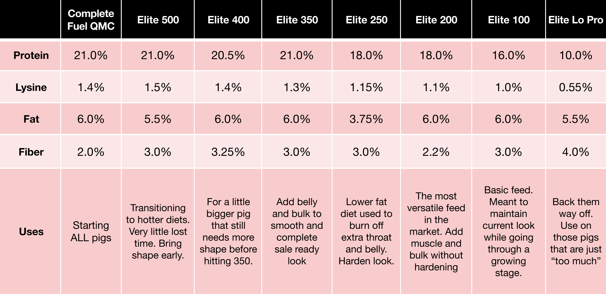 A complete show feed for pigs weighing 150 pounds to market. To be used after the Elite 200 product. Use this complete feed to allow pigs to “just grow.” Contains high lysine to energy ratio, to promote faster growth and without sacrificing lean muscle mass. This product can be used to help soften the look of a market pig.
